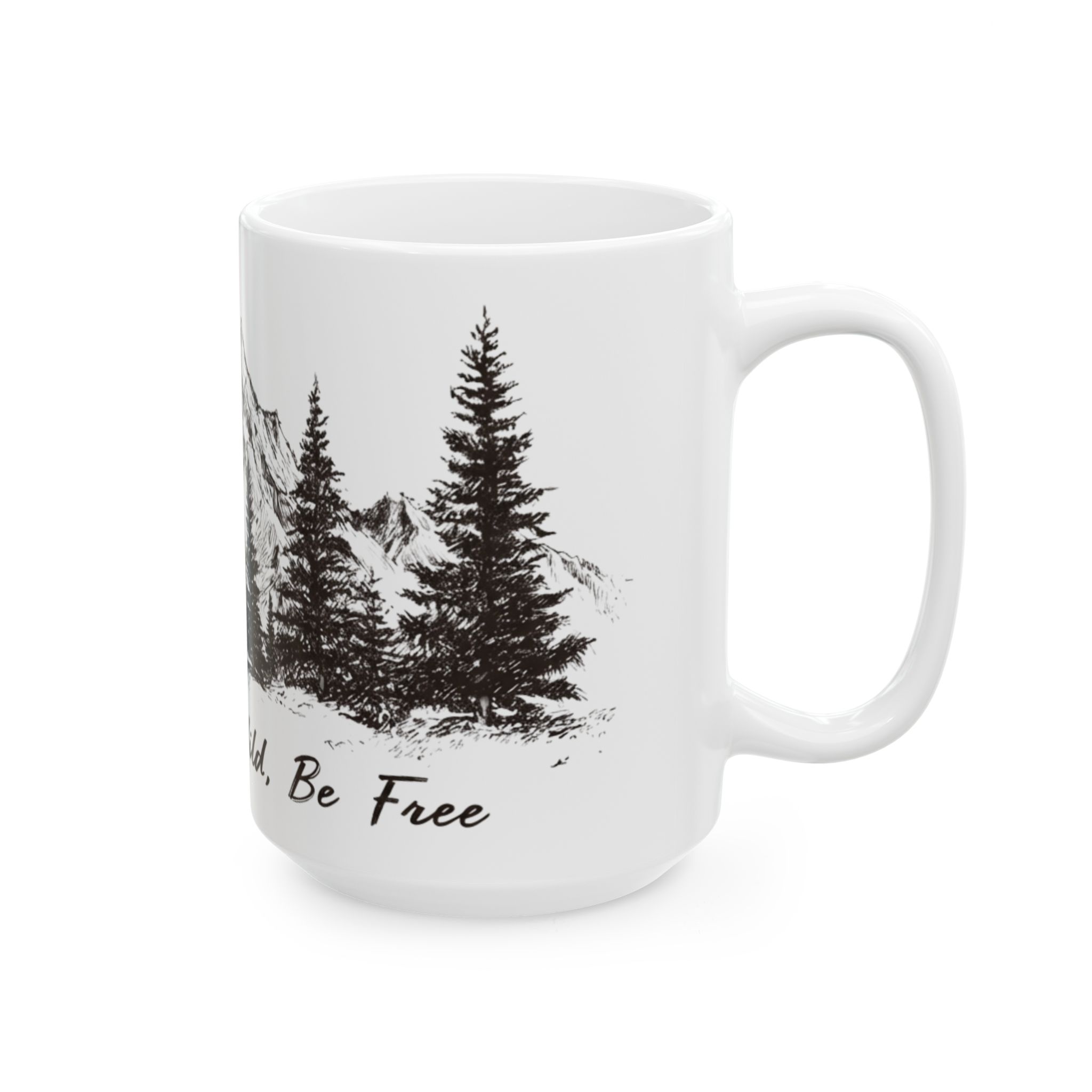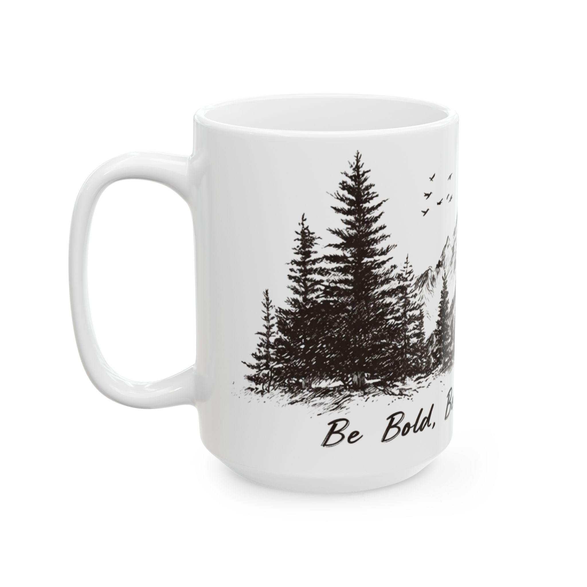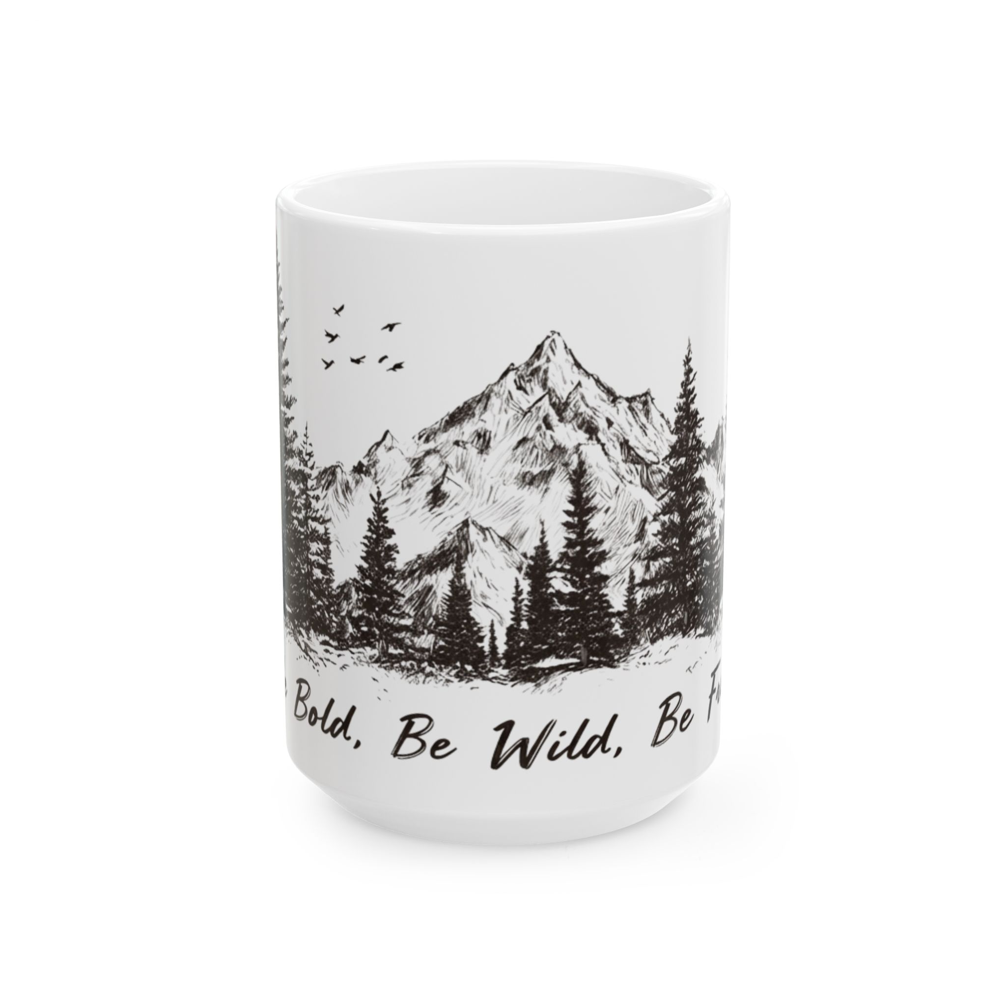 Warm light filters through the kitchen as you cradle a glossy ceramic mug that feels sturdier than it looks. A hand-drawn mountain scene wraps around the white surface: jagged peaks, tall pines, and a scattering of birds — all rendered in ink-like strokes that invite quiet mornings and slow sips. Beneath the illustration, a handwritten mantra murmurs encouragement, a small ritual before the day begins. This mug slips easily into everyday life — camping coffee poured inside before a trail, early weekdays at the desk, or evenings by a window listening to rain. It speaks to people who carry the outdoors with them, not as a trend but as a steady rhythm. The vibrant print stays crisp against the glossy white ceramic, and the comfortable C-handle makes it a pleasure to hold with the generous 15oz.