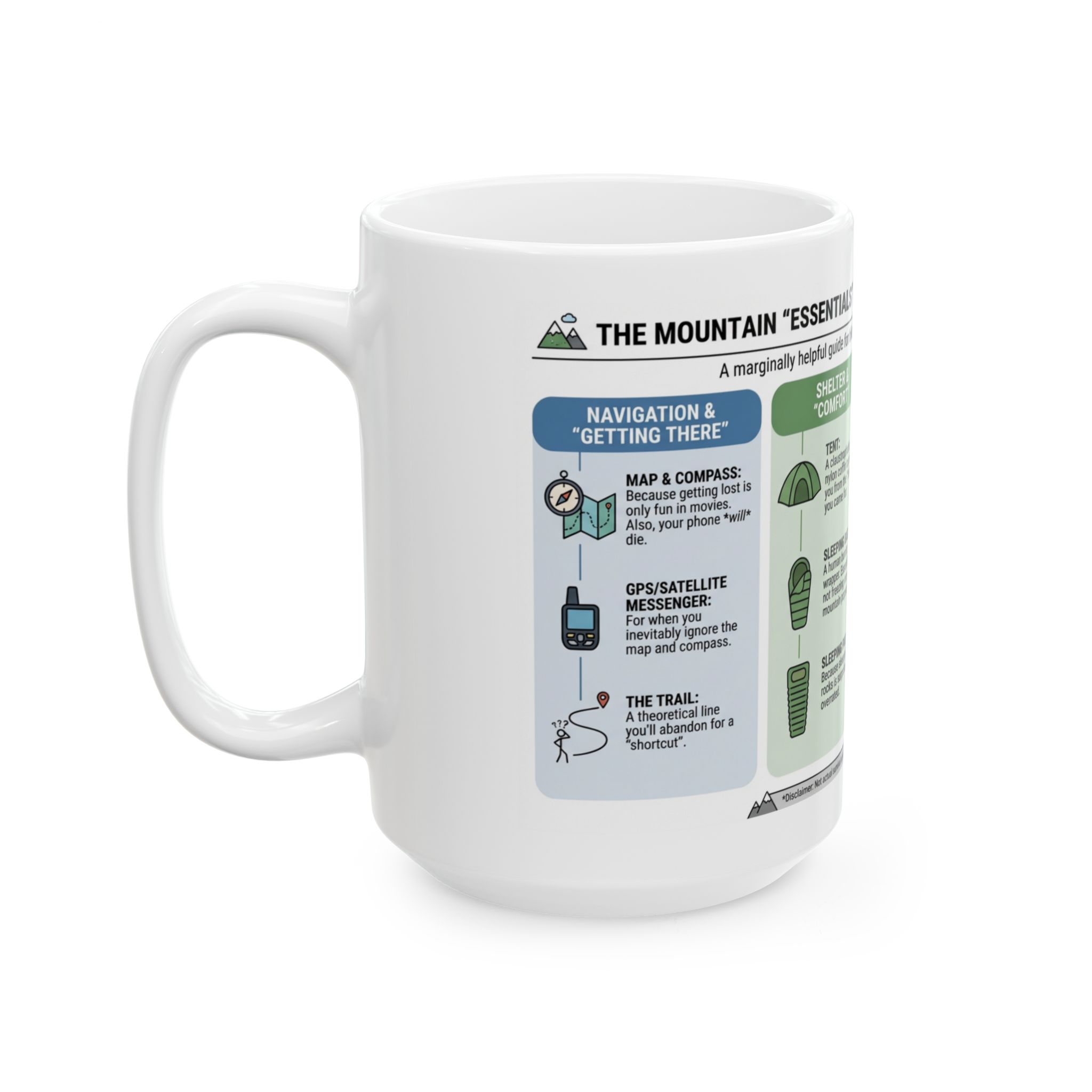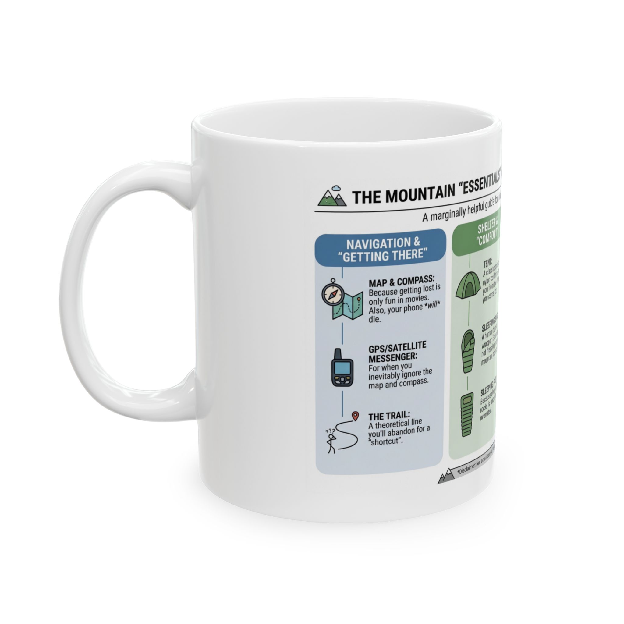 The Mountain Essentials Coffee Mug features a humorous guide to the “must-have” gear for hiking, backpacking, and fishing. From maps you’ll probably ignore, to tents that feel like nylon burritos, to the eternal hope of catching dinner, this design pokes fun at the realities of outdoor adventures.