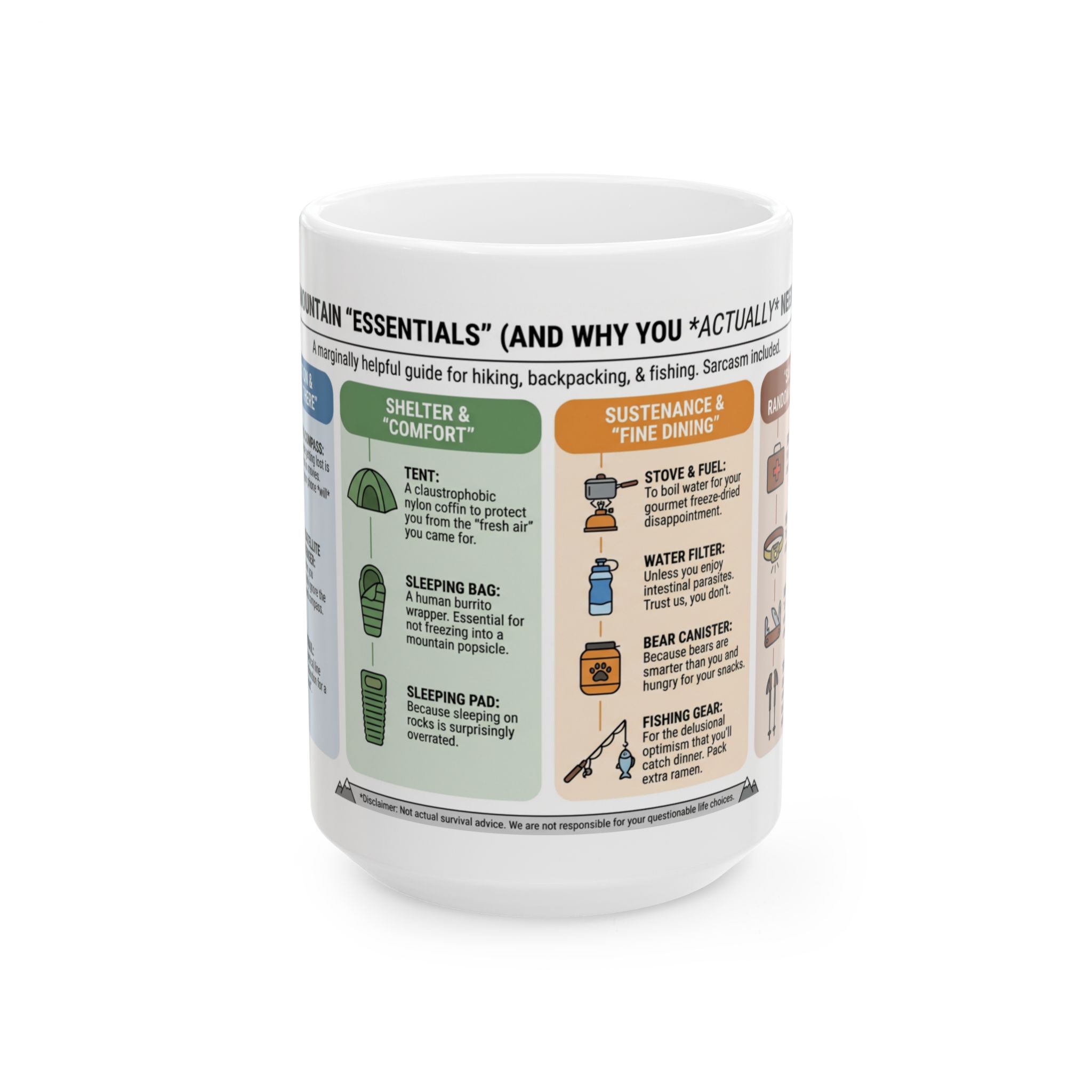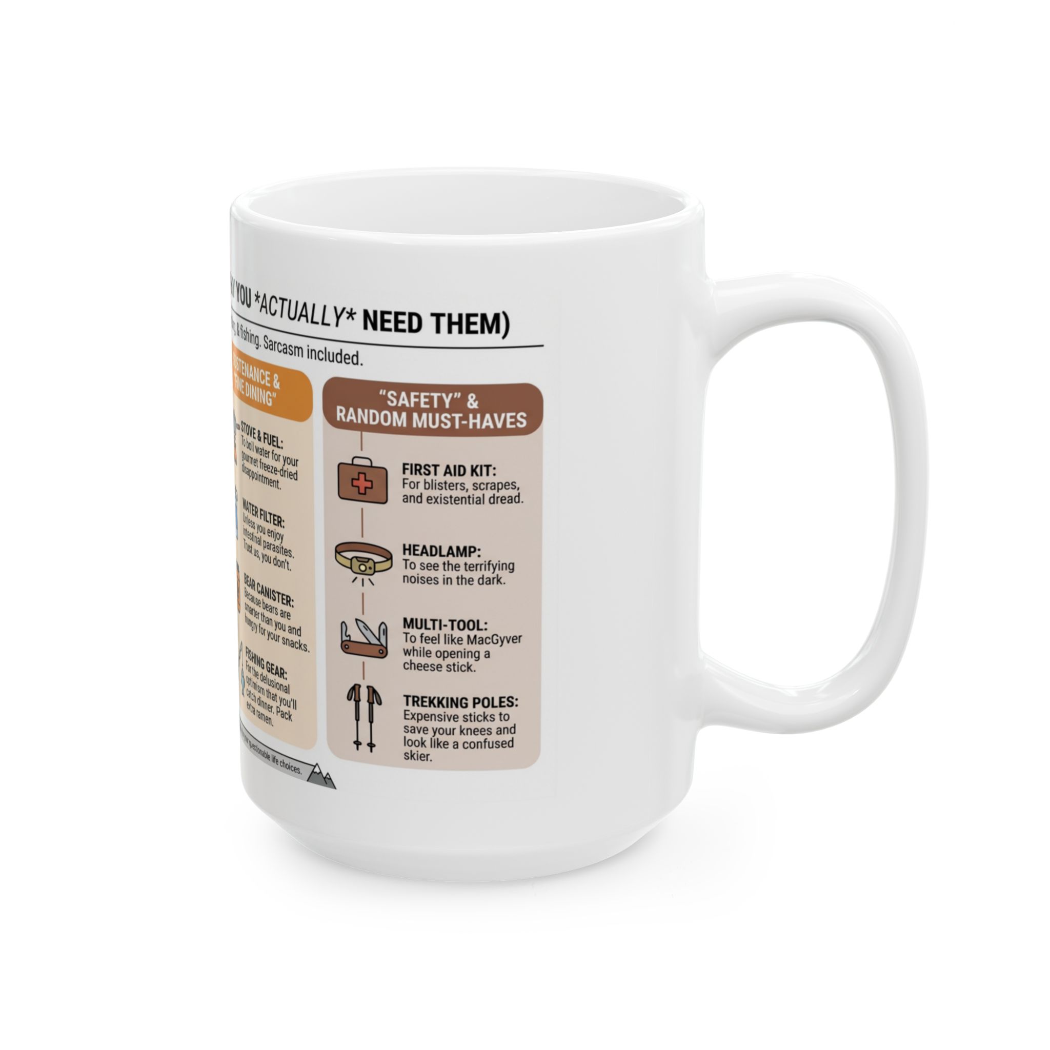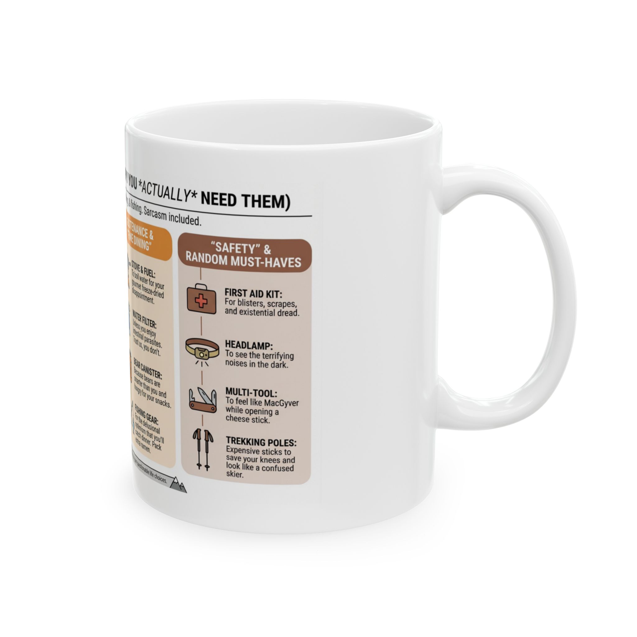 For anyone who has ever packed way too much gear, gotten “slightly” lost on the trail, or convinced themselves that ramen counts as gourmet backcountry cuisine — this mug is for you.
